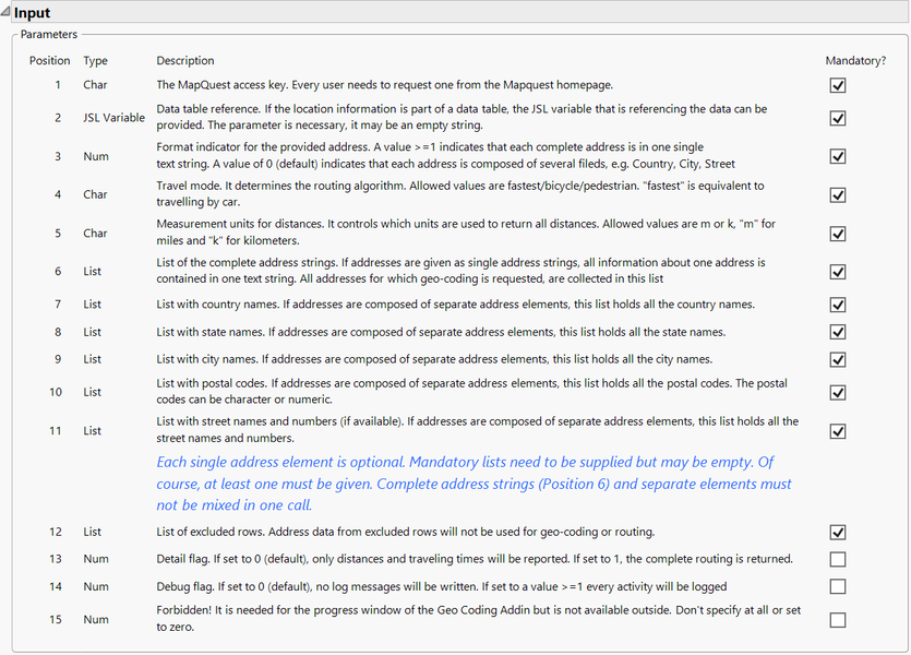 Since data tables are the usual way to collect information in JMP, analysis starts with the user assigning roles to the columns of the data table via a user dialog. The Geocoding 2020 add-in works the same way. After the user has completed the dialog, the program collects the relevant data from the data table, translates it into the structure needed by the REST API and then sends it to MapQuest. So, the rough structure of the program is: 1) complete the user dialog, 2) collect data, 3) prepare data for interface, 4) send interface request, 5) interpret results, 6) write JMP data table(s). The third step, data preparation, is defined as a function and is available as MapQuest_route.jsl in the JSL Cookbook. You can embed it in your own geo application or use it to get ideas of how to structure data for REST calls.