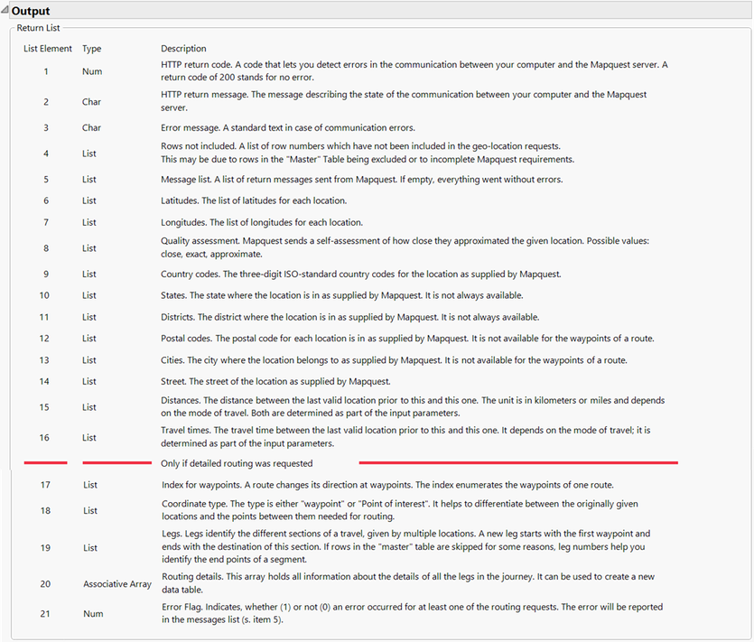 If a JSL variable with a reference to a data table is supplied for parameter 2 and detailed routing is requested, then it is assumed that the list of locations is identical to the list of locations in the data table. All content of the referenced data table will be copied and inserted into the array with the detailed routing. This information can only be linked to the points of interest, since all lists have missing values for the waypoints.