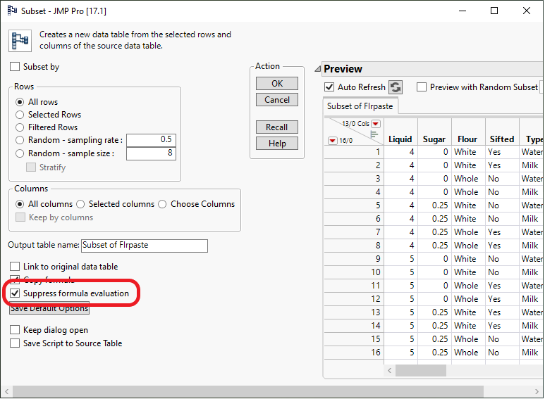 Figure 3: Suppress formula evaluation option in Subset