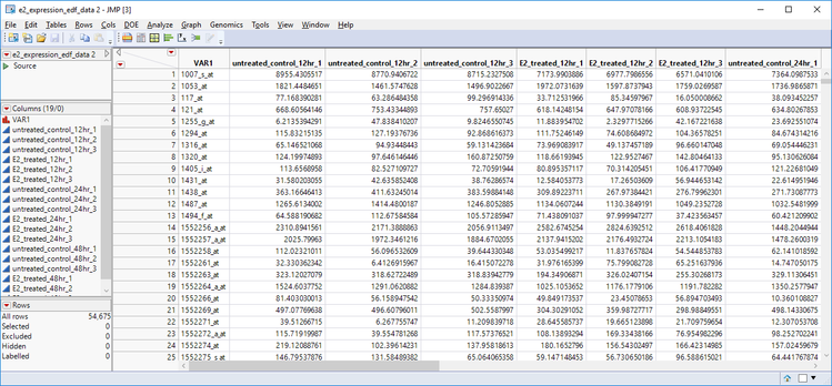 - Open the e2 _expression_edf_data.sas7bdat Inspect the structure of the experiment. Each column represents a group (experimental/control) measurement at a specified time (12 hrs/24 hrs/ 48 hrs). Three measurements are taken for each group at each level for a total of 18 measurements taken at six different experimental conditions.