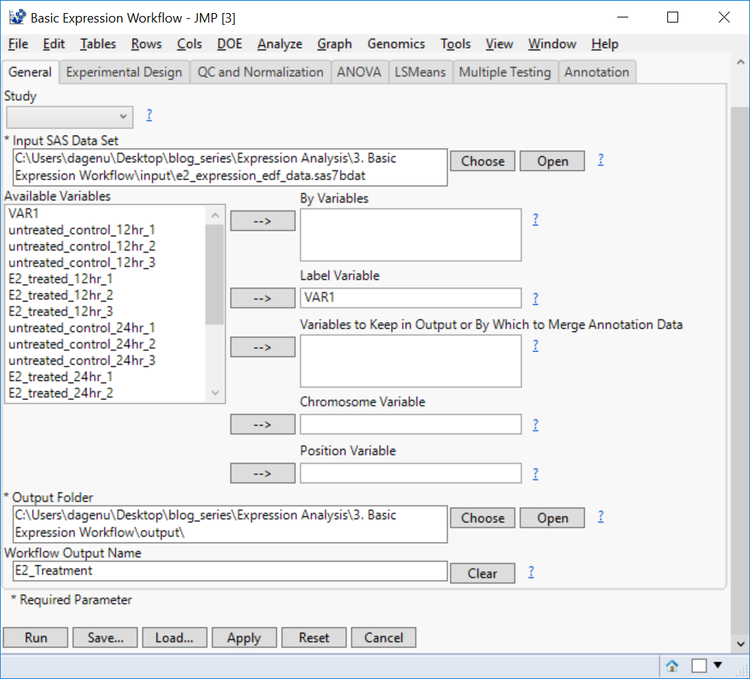 - In the General tab, choose e2 _expression_edf_data.sas7bdat as the Input SAS Data Set.