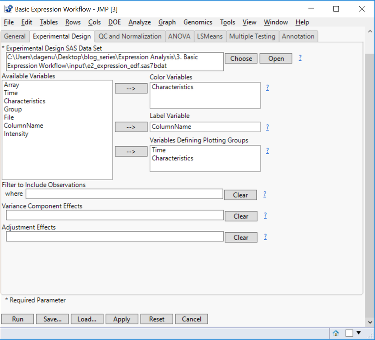 - In the Experimental Design tab, select e2_expression_edf.sas7bdat as the Experimental Design Data Set. This data set contains information about the design of the experiment and is required for analysis. For more information on how this data set was created see: Expression Analysis with JMP Genomics, Part 1: Experimental Design.