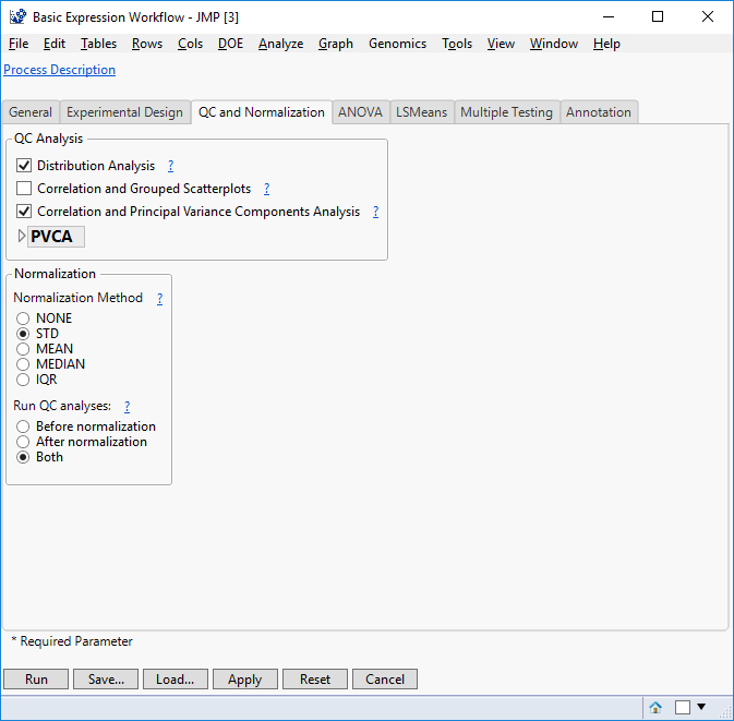 The Basic Expression Workflow is an effective way to string together a series of analyses and compare expression levels across experimental conditions. This workflow is highly recommended for launching into expression analysis. It allows for data standardization and QC, data exploration such as distribution and correlation analyses, and expression and LSMeans analysis. From the output window, it is easy to continue analysis in the Drill Downs menu and fit a model to your data.