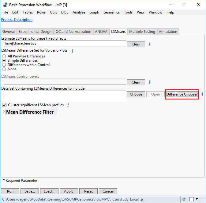 - To ensure the proper differences are calculated in the output, select Difference Chooser (highlighted in red below). This will open a new window showing the default differences that will be calculated for use in the volcano plots.