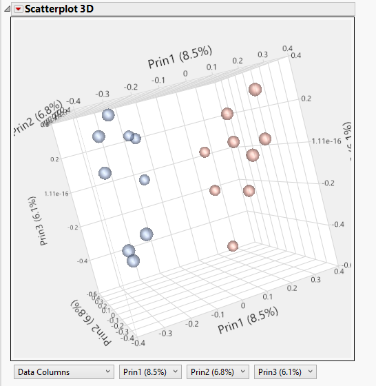 - The 3D PCA Plot tab gives a 3D scatterplot of the principal components. Red points are groups that were treated with estrogen while blue points are control groups.