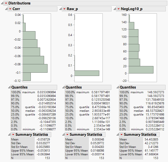 - The Correlation Distributions tab shows the distributions of the correlation matrix and their p-values. The low p-values are indicative of robust results.