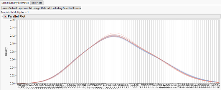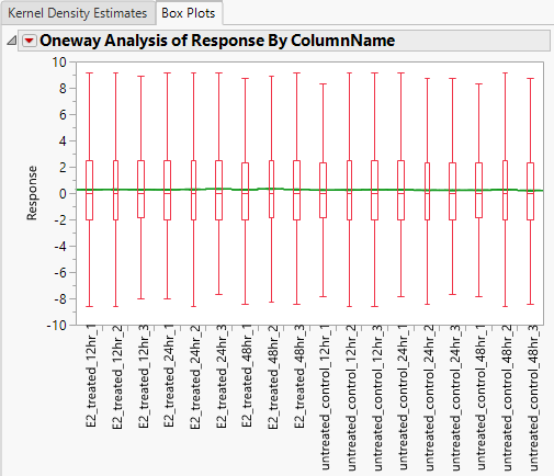 - Return to the Journal window again and select Distribution Analysis. This is the standardized density curve and box plot resulting from normalization with medians of each response group centered at 0.