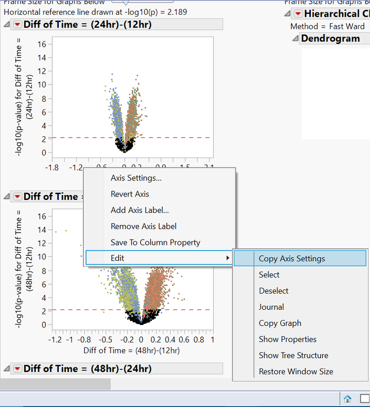 - Notice the x-axis on each of the plots (representing the difference in expression) is not uniform. In order to analyze these plots effectively, the axes will need to be changed. Right-click the x-axis of the first plot and select Axis Settings.