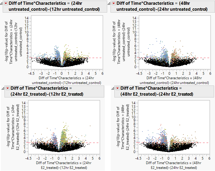 - Below, we compare the volcano plots of the control and experimental groups for the change in expression from 12hrs to 24hrs and from 24hrs to 48hrs. Once again there is a decrease in expression levels from the 24hr to 48hr measurements, and an increase in expression from the 12hr to 24hr timepoints. This is more defined in the groups that were exposed to estrogen.