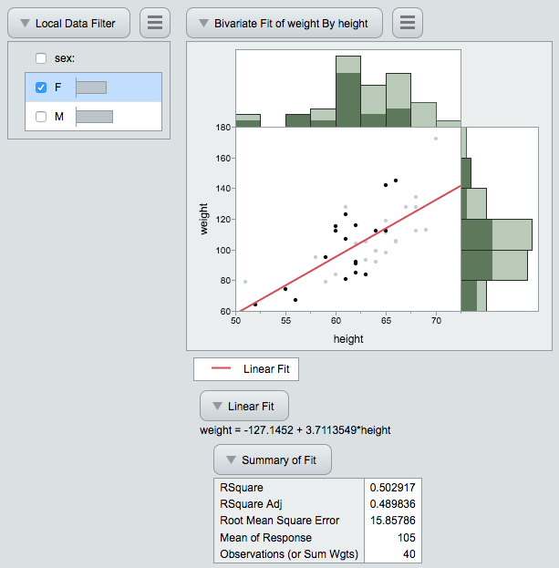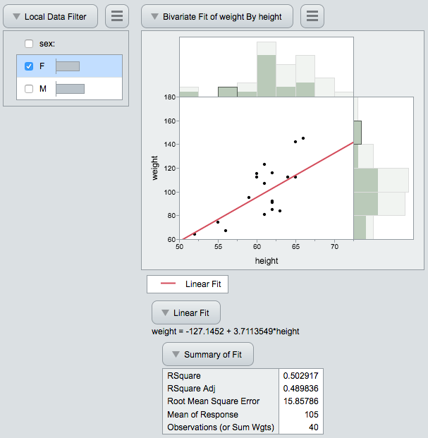 Creating a filter is simple. Just choose the “Local Data Filter” menu in any JMP report. Then choose “File: Save As: Interactive HTML” (“File: Export: Interactive HTML” on the Mac). The figure below shows a Distribution analysis with the Females selected.