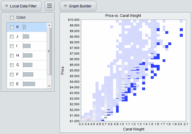 This also gives our users more power. Consider this heatmap of diamond prices versus weight. It’s no surprise that larger diamonds fetch a higher price, but other factors matter also. The data filter shows that price also depends on the diamond’s color: the whiter diamonds (“E”) are the most valuable.