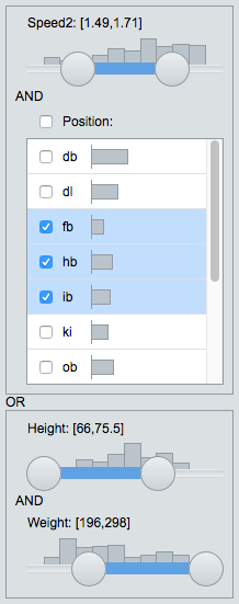 Continuous filtering is also supported. This chart of mean weight of football players shows that the larger, heavier players tend to be defensive and offensive linemen (“dl” and “ol”). These positions don’t require speed, and filtering on speed shows that indeed these linemen are among the slowest players. The fastest players are the defensive and offensive backs (“db” and “ob”), the halfbacks and quarterbacks (“hb” and “qb”) and the wide receivers (“wr”).