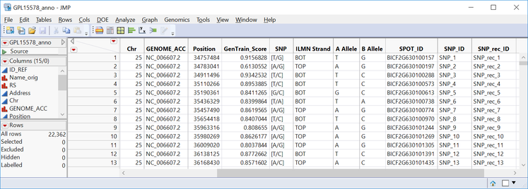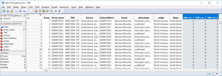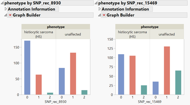 JMP Genomics has an array of tools to associate genetic variants with traits. One of the most straightforward of these tools is SNP-Trait Association. By performing this analysis, you can quickly identify significant markers for multiple categorical or quantifiable traits. In this example, we explore ~22,000 markers for histiocytic sarcomas (tumors) in a sample of 474 Bernese Mountain Dogs. The phenotypic classification for this data is binary (either affected or unaffected), but note that this guide works for continuous traits as well as multiple traits.