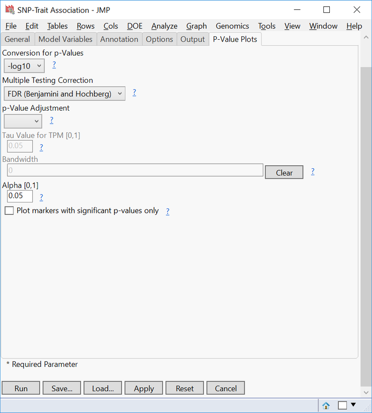 7. Set the Alpha, the level at which a p-value must be for its associated marker to be considered significant, to 0.05.7_pval_plots_snpt.png