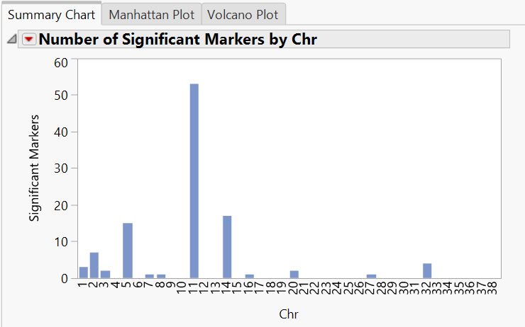 1. When the analysis finishes running, the results window will appear showing the Summary Chart This tab shows the number of significant markers on each chromosome. 8_results_sig_markers.png