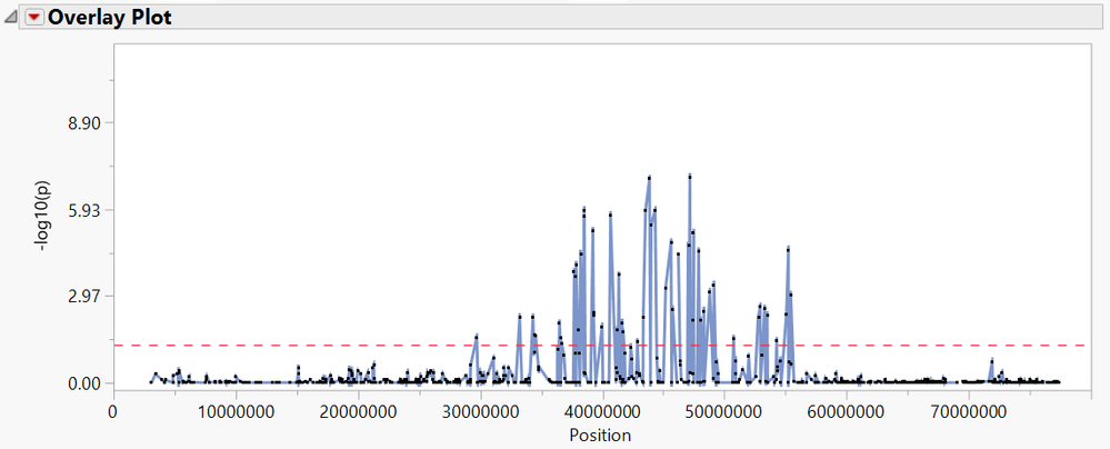 • Notice the p-values for each marker are plotted by their position on the 11th This information comes from the Annotation Data Set added earlier.  Each of the markers that fall above the red dotted line (p = 0.05) are statistically significant.9_results_chr_11.png
