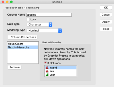 For preset graphlets that use categorical columns, select the Next in Hierarchy column property, found in the data table, to specify which columns will be used in the next level of a drill-down.