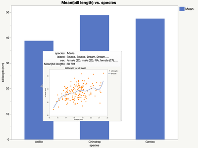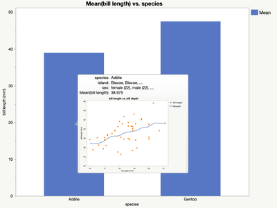 In the following animated gif, the Distribution graphlet preset is used to look at the distribution of bill lengths per species in the Penguins.jmp data table. After applying the preset and hovering over the bars, the distribution graphlet appears in the hover label. In the top-right corner of the hover label, there is a pin option that keeps the hover label present on the graph. Notice below that there are two pinned graphlet labels side by side, allowing for an easy comparison of the distribution of the data all in one chart.