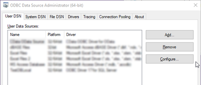 - Note System DSN tab configures ODBC for all users of the machine. Configuring the driver via the System DSN tab may be restricted based on your internal security policies. In this case, use the User DSN tab to configure the driver for the currently logged-in user.