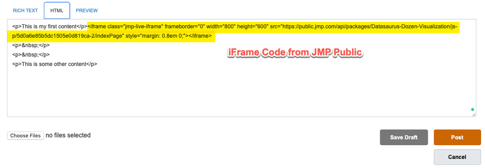 Now that the iFrame is in the HTML, I can go the Preview tab and have a look at the embedded JMP Public content.