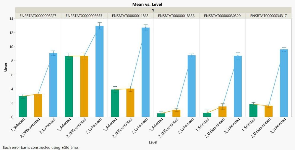 Next, I regrouped all differences into one data table, using Graph Builder to show the end results. A significant difference of expression is represented in all six genes at the Luteinized tissue stage, which was not a surprise considering the earlier results obtained in the Fit Y by X platform and in Multivariate Embedding.