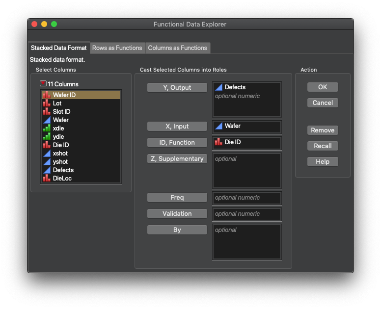 So, how do we change our perspective? The first step, getting the data into JMP Pro, particularly for images, has been covered by @JohnPonte in a couple of Community posts (Image Analyzer presentation and add-in) a few years back. You need a stack of data that has your response of interest, and the (x,y) coordinate pair for each pixel, die, etc. After this, we treat the images (wafer maps) as a time variable and the pixel ID (die ID) as the function ID.