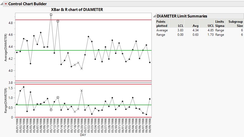 This JSL opens the Diameter sample data table and creates an XBar and R chart. From the red triangle next to Control Chart Builder, select Graph Spacing. In the dialog, change the value from 2 to 5 and click OK.