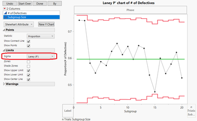 Laney P’ and U’ control charts were added to Control Chart Builder in JMP 17. These charts are useful when subgroup sizes are large, which causes narrow limits in the traditional P and U charts. Laney charts do this by adding a term to the limit formulas that account for the amount of variation that is not explained by the model assumptions.