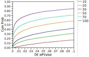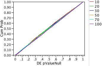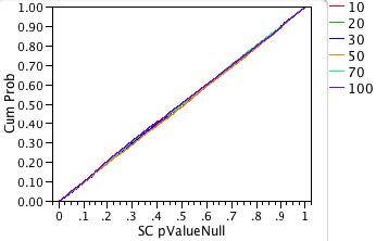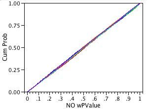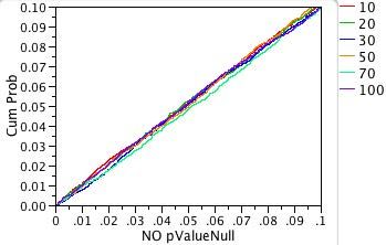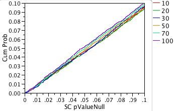 On the other hand, suppose a line had crossed the vertical dotted line at 0.05 at a CumProb value of 0.06. Then, instead of seeing the expected 5% Type I errors, we would actually see 6% Type I errors. We call such a test too liberal because the true error rate is larger than expected.
