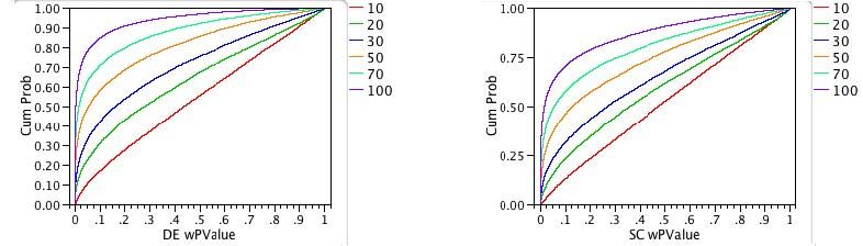 To produce the plots in Figures 3a and 3b, we first sorted the 10,000 p-values. The y-axis is the proportion of the 10,000 p-values less than or equal to a given significance probability. The x-axis shows the significance probabilities (pvalues). Each sample size is shown in a different color.