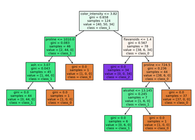 First, let’s see what we get when creating a decision tree model in Python. (The script is attached to this post.) The resulting model can be graphed with matplot lib, as shown below. The first model classifies according to color intensity, proline, ash content, flavonoids, and alcohol content.