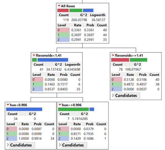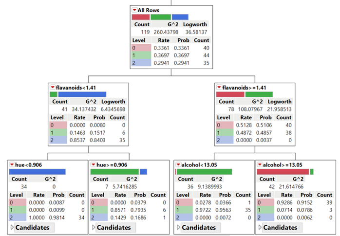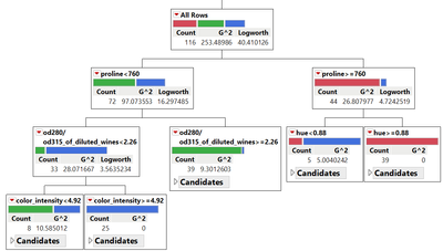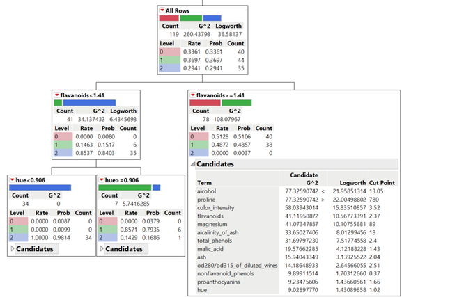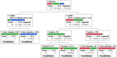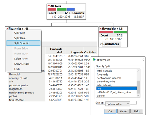Next, expand the Candidates list under flavonoids < 1.41. Color intensity is now at the top of the list. However, perhaps it’s easier to measure the hue over the color intensity; if so, click on the red triangle and click on Split Specific. You can then choose the parameter for the split -- in this case, hue -- and click OK.