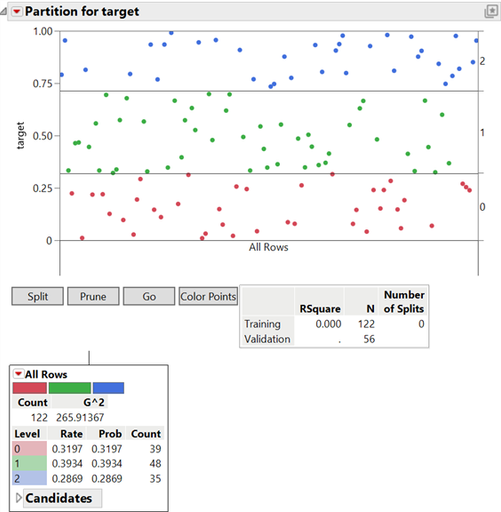 First, we're going to click on the Prune button. By clicking on Prune, you can go a step backward and remove one branch at a time. Next, click on the Candidates list and order the features by their G^2 or Logworth Splitting Criterion, allowing you to analyze which parameters are at the top of the list.