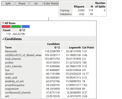 The G^2 value tells us that the model will choose flavonoid as the splitting criterion. If you click on Split, the branch split will happen using flavonoids value of 1.41.