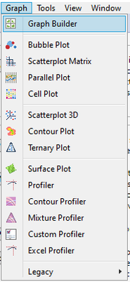 Before we look at data visualizations in JMP, recall from the introduction that JMP is designed to be interactive software. Most of this interactivity comes in the form of little red triangle icons in various places on the data and output that enables the user to explore additional analysis. SPSS output is mostly static, and further exploration requires reopening the graph of analysis platforms and reselecting options. We start again with a basic bar chart. Users can easily access graphing features via the Graph menu item from the top menu bar. For most graphs and charts, JMP’s dynamic and user-friendly Graph Builder is the logical choice. To make a bar chart, we select the Graph Builder, which also allows a variety of other graphs, such as pie charts, bubble plots and line graphs.