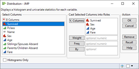 Like the Frequencies dialog box in SPSS, JMP has the Distribution platform to obtain simple descriptive output. The Distribution platform is found under the Analyze menu. We start by selecting Survived, Sex, Age and Fare.