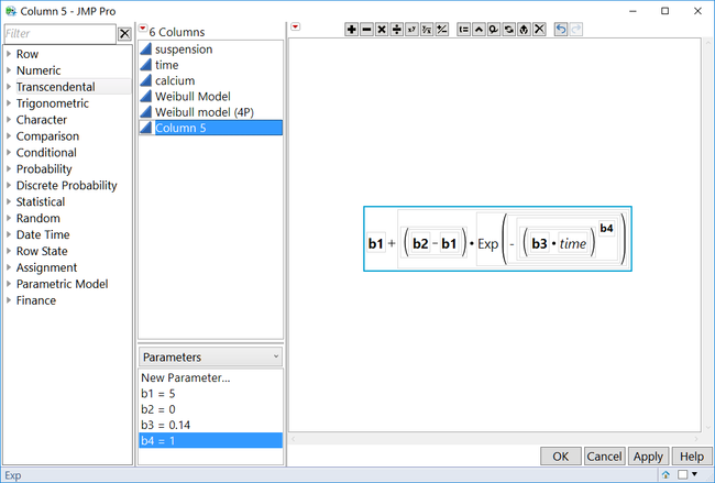 To enter this as a column formula in JMP, the first step is to define the parameters and their starting values. To begin, create a new column in the data table and add a column formula. In the Formula editor, change the list choice in the center bottom panel from Constants to Parameters.