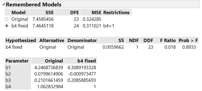 In examining these results, note that the estimate for parameter b4 is very close to 1. Given that b4 represents an exponent in the model, if it is equal to 1, it has no effect on the computation and does not need to be included in the model. To explore the effect on the model if you fix b4 at 1 first, remember the current solution by clicking on the red triangle and selecting Remember Solution. Name this model Original. This adds a new section to the results window with fit statistics and parameter estimates for the remembered model. Scroll to the control panel in the results window. Change the value of b4 to 1 and click in the square to lock that value. Rerun the model by clicking Go.