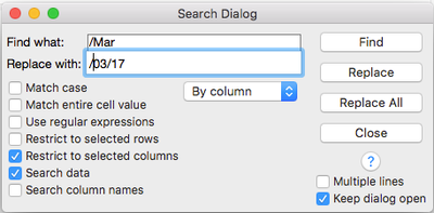 First, correcting the date is a series of Find & Replace operations using “-<mon>” as the "find" and “/mm/yy” as the "replace." In practice, this looks like this: