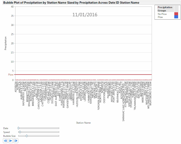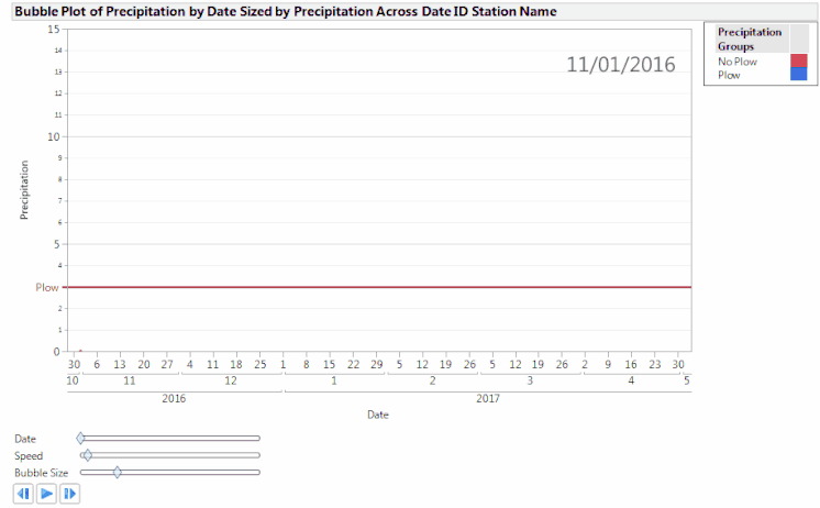 The first bubble plot is an animated time plot. When animated, it traces the daily precipitation and colors the line based on the how close the precipitation level is to the critical 3-inch level for plowing.