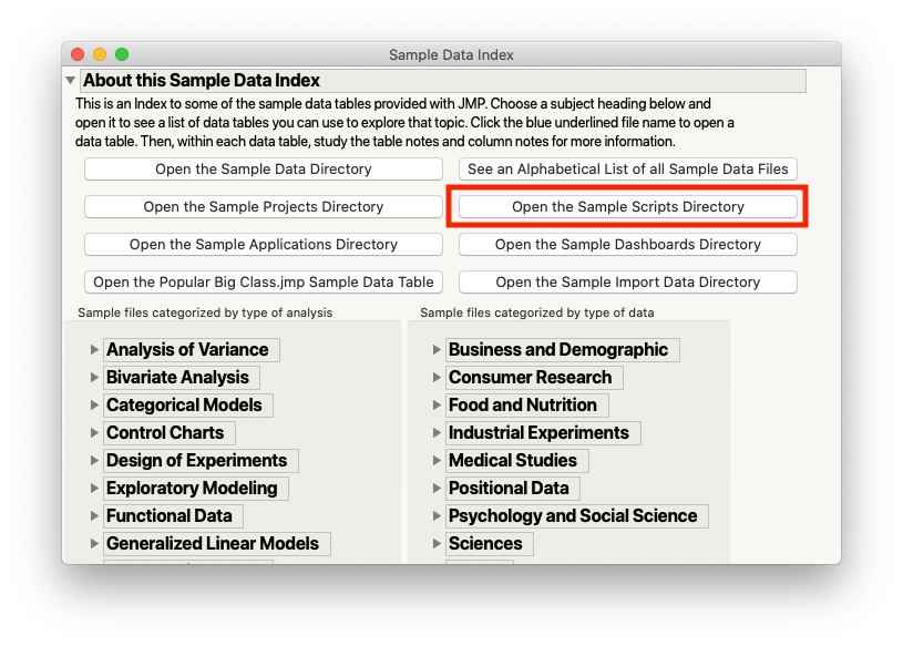 Now, in JMP go to Help > Sample Data. Note the buttons along the top of the interface. One of them says, “Open the Sample Scripts Directory.”