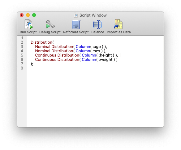 JMP has created a Distribution Report: Distribution(…);. JMP has put two Nominal Distribution subgroups into the report: Nominal Distribution(Column(…)) and two Continuous Distribution subgroups: Continuous Distribution(Column(…)). At the end of the script, JMP has put an incredibly important piece of code: the “;”. It’s called the “Glue Operator” and we’ll cover it in more detail in the next episode. For now, you just need to know that it’s a way to signal to JMP when it’s running the code that another instruction is coming. The fact that JMP puts that on the end automatically makes the novice scripter’s life a lot less complicated.