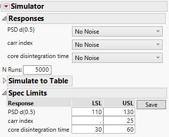 The example data has a script to run the model analysis with the simulation settings noted. JMP can be used quickly and efficiently during meetings to illustrate predictions of the operational population of batches. The operations team would prefer to run the granulation process with a spray rate of nine gallons per minute, 30% fluid added, 45 RPM impeller speed, and a wet mass time of 11 minutes. Figure 4 includes the preferred settings with the Simulate button pressed, creating 5,000 model simulated runs.