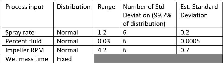 Knowledge about the general shape and extent of the variability add robustness to model estimates. Subject matter experts (SME) provide a range of actual results expected for process settings that are within the design space. SMEs noted that variation in inputs tend to vary equally above and below the set point; therefore, it is reasonable to assume that each input varies following a normal distribution. The standard deviation for each input is estimated by dividing the reported range of values by 6. Table 2 is the result of research into the process variables.
