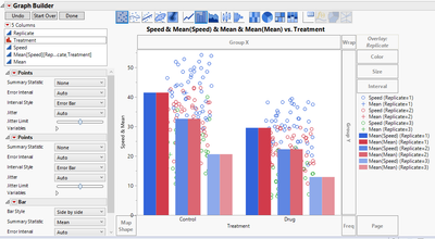 The article contains sample data consisting of two treatments and three replicates within each treatment. Each replicate is measured 50 times. The desired graph displays both the raw data, as well as a summary of the data across the 50 records of each treatment. For each treatment, the mean and standard error of the mean are calculated with an n = 3, not of the full data, and then added to the plot. The first step in JMP is to make a summary column and add that to our data table. To do this in JMP, select the Replicate and Treatment columns simultaneously. Then right-click and choose New Formula Column > Group By. There is no change to the data after this step. Next select the Speed column, then right-click and choose New Formula Column > Aggregate > Mean to add a new column to the data table with means. While this column contains the desired summarized data, the values are each repeated 50 times, so we have not yet reduced our N. To reduce the N, we want to remove duplicate records. One way to do this is to copy the data into another column and then select Replicate, Treatment, and the Copy of the Mean column. Click Rows > Row Selection > Select Duplicate Rows to select 294 rows. Now click on the Mean column and press Delete to clear the duplicate records.