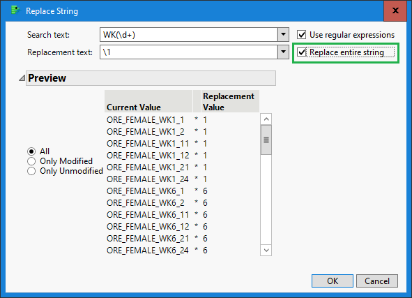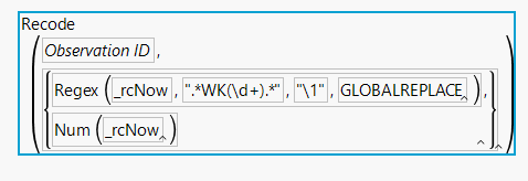 Step 5. Now, we have the number (ex. 1) in the place where the matched string was before (ex. “WK1”). However, all we want is the digit. There’s a new checkbox in Recode that replaces the entire string with the replacement value.