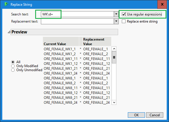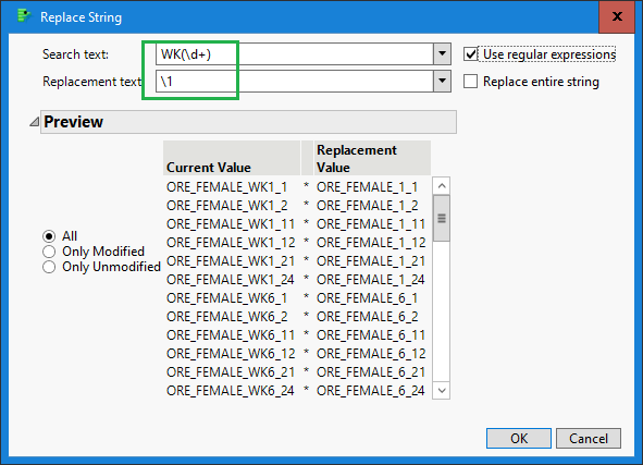 Step 4. Looking at our replacement values, we can tell that the regular expression found WK1, but replaced it with nothing. We can use \1 as the replacement text to replace the match with the first capture group. We don’t want the entire string, only the numeric portion, so we add parentheses to create a capture group.