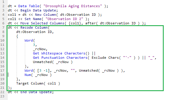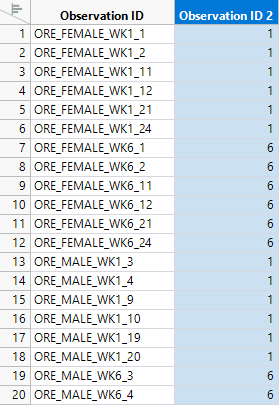 For example, let’s take the sample data set Drosophila Aging Distances. Say we want to get the WK number out of the Observation ID column and put it in a separate numeric column. We notice that the field has a regular pattern where the WK number is the third field.