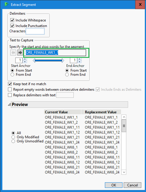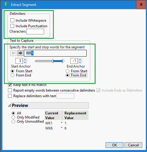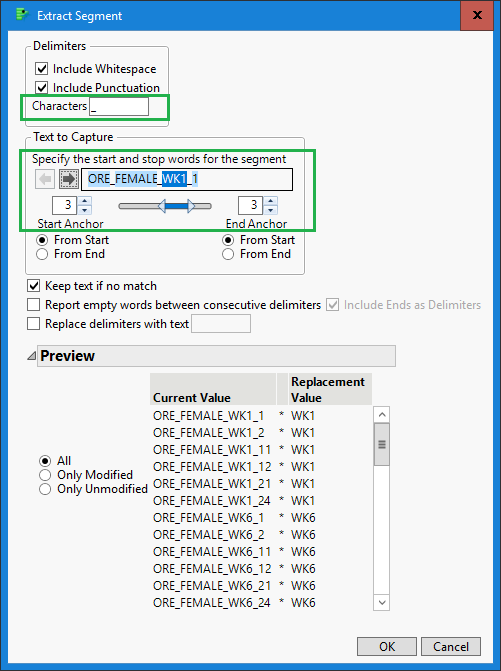 Once we add the delimiter, we can see that the first sample contains four words. I have used the slider to move the selection to the third word. You can see in the Preview area that we are now capturing the WK portion of the string. We use the OK button to finalize this step in our process.