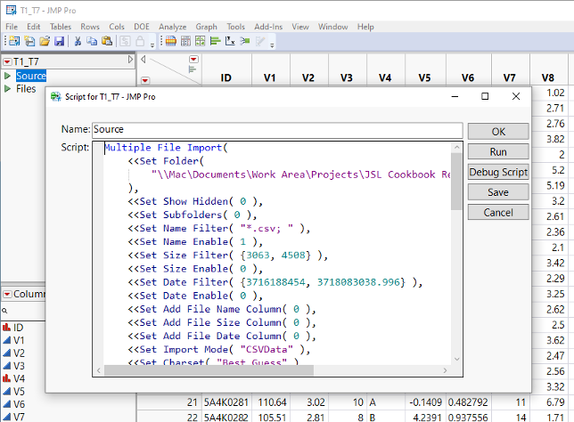 - The Source table script contains JSL for recreating a table it appears when a non JMP file is opened or when table operations create a new table.